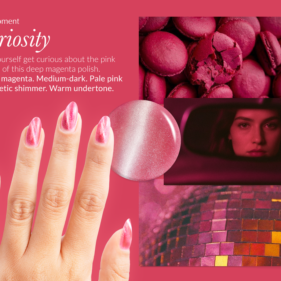Let yourself get curious about the pink sheen of this deep magenta polish.