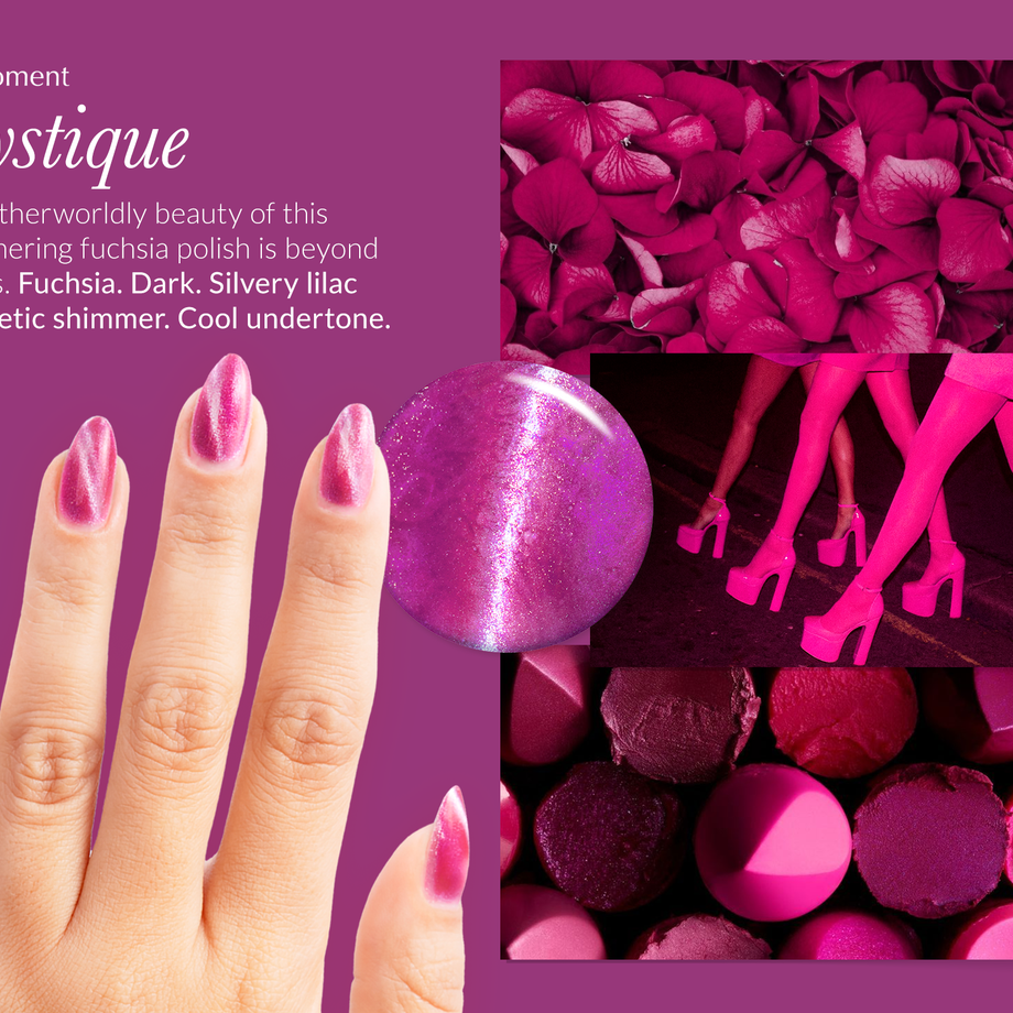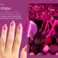 Fuchsia. Dark. Silvery lilac magnetic shimmer. Opaque. Cool undertone.